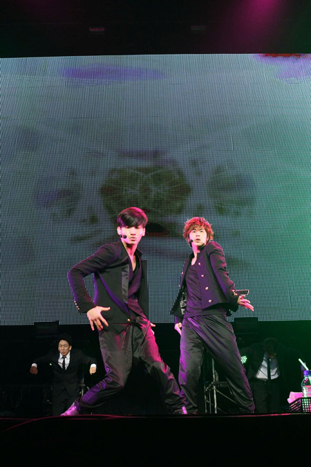 ソロ・コーナーでは、ふたりが“サプライズな特技”を披露。チャンミンは、今年の誕生日にツアーのスタッフからプレゼントされたというギターでExtremeの『More Than Words』の弾き語りを初披露した。「マネージャーから『今度ギターを演奏してみる?』って言われたんですが、今回のイベントでやることになるとは予想できなかった。初めてギターを弾きながら歌おうとすると緊張しますね」と不安げ。しっとり聴かせるも、途中で「歌詞忘れた~」と茶目っ気たっぷり。そんな姿にファンは大喜びで、ユンホも「思ったより上手くてびっくり。歌詞を忘れたのは残念だけど、格好良かった!」と賞賛したが、チャンミンは「まだファンの前で演奏するのは早いって……」とガックリと肩を落としていた。一方のユンホは、「子どものときはシェフって言われていました!」と、野菜ビビンそうめんを作って料理の腕前をアピール。危ない包丁さばきに対し、ファンからどよめきが起こるも、ユンホにはどこ吹く風。恐る恐るチャンミンが試食すると、「僕が作るものより、ちょっと美味いかも。(あとは)盛りつけだけキレイにしたら、美味しそうに見えたのに……」とコメントし、会場を沸かせた。