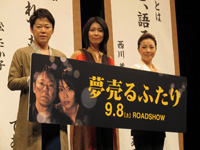 『ゆれる』『ディア・ドクター』の西川美和監督の最新作『夢売るふたり』の完成披露試写会が行われ、西川監督と主演の松たか子、阿部サダヲが登壇しての舞台挨拶が行われた。
