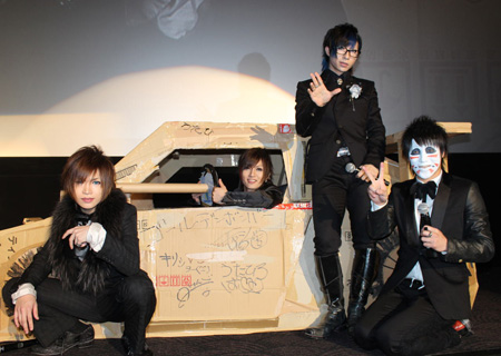 ヴィジュアル系エアーバンド“ゴールデンボンバー”が2日、東京・TOHOシネマズ六本木ヒルズで開催された人気シリーズの最新作『ワイルド・スピード EURO MISSION』の公開記念イベントに出席。メンバーの鬼龍院翔、歌広場淳、樽美酒研二、喜矢武豊は、「スーパーでもらってきた段ボール」(関係者談)で製作された“スーパーカー”をプレゼントされ、ご満悦!? の様子だった。