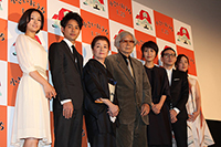 松と同じく9年ぶりの山田組参加となった吉岡は「まったく自信がありません。(俳優として)何もできなかったと、今も反省の日々」と弱気な発言。一方、前作『東京家族』に引き続き、山田監督作品に出演する妻夫木は「うれしくて、親に電話しちゃいました」と声を弾ませた。また、ベテラン女優の倍賞は「久しぶりの山田さんの作品で、緊張しました」。それでも「監督はお腹が空くと、機嫌が悪くなっちゃうので、元気なさそうに見えたら、みんなで『お肉を食べさせよう』って(笑)」と日本映画界の巨匠の“秘密”を明かす余裕も見せていた。