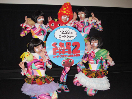 米アニメ『くもりときどきミートボール2 フード・アニマル誕生の秘密』の初日舞台あいさつが28日、新宿ピカデリーで行われ、日本語版主題歌『たべちゃいたいの』を歌うTEMPURA KIDZ(P→★、KARIN、NaNaHo、YU-KA、AO)が登場。劇場に駆けつけた約200人の観客を前に、キレのあるダンスパフォーマンスを披露した。