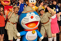 会場に詰めかけた子どもたちの「ドラえもん!」という呼びかけに応えて、ドラえもん、のび太、しずかちゃん、ジャイアン、スネ夫の着ぐるみがそろって登場。さらにCOWCOWの多田健二と善しも探検隊の衣裳で登場し会場を盛り上げる。COWCOWはこの日のために考えてきた、持ちネタの「あたりまえ体操」のドラえもんバージョンを披露。「ジャイアンは映画になるといいヤツ」「どこでもドアでしずかちゃんの家に行くといつもお風呂」といったネタで、客席は子どもたちの笑い声が響いた。