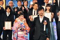 新人俳優賞(池松壮亮、上白石萌音、小松菜奈、登坂広臣、能年玲奈、福士蒼汰)に続いて、スタッフ部門の表彰が行われたが、最優秀美術賞、撮影賞、照明賞、録音賞、編集賞と『永遠の0』が受賞。スタッフ部門で同作以外では最優秀音楽賞をミュージカル仕立ての『舞妓はレディ』の周防義和、最優秀脚本賞を『超高速!参勤交代』の土橋章宏が獲得した。