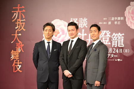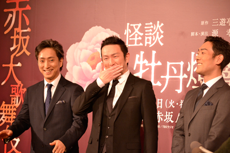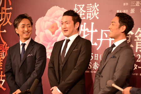 同じく二役演じる勘九郎は「2013年に3人(中村獅童、中村勘九郎、中村七之助)でやった時に、赤坂大歌舞伎はいろんな方向にいけると確信した。3人なら怖いものはない」と話し、「(演じる)新三郎は、ドラマでは七之助が演じていた役なので、参考にしながら役作りをしていきたい。」と笑わせながら、「『牡丹燈籠』は怪談だけでなく男女の因果因縁、敵討ち、親との師弟の関係も含まれているので、どのように膨らんでいくかを楽しんで頂きたい」と語った。