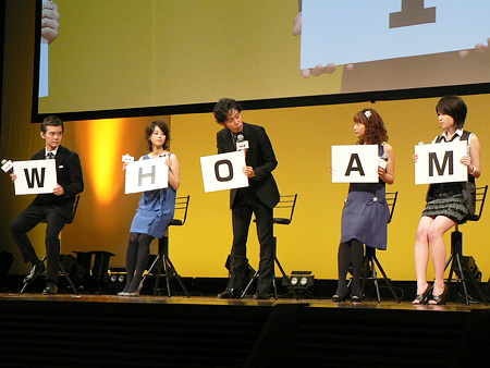 自身の名前の頭文字が書かれたパネルを持つ登壇者たち。「WHO AM I」の“I”は誰? 12月に公式サイトで発表します。